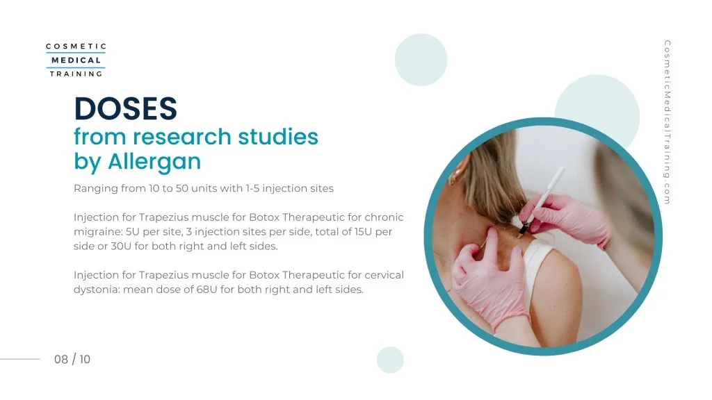 Dosage from research studies by Allergan: Ranges From 10 to 50 units with 1-5 injection sites.