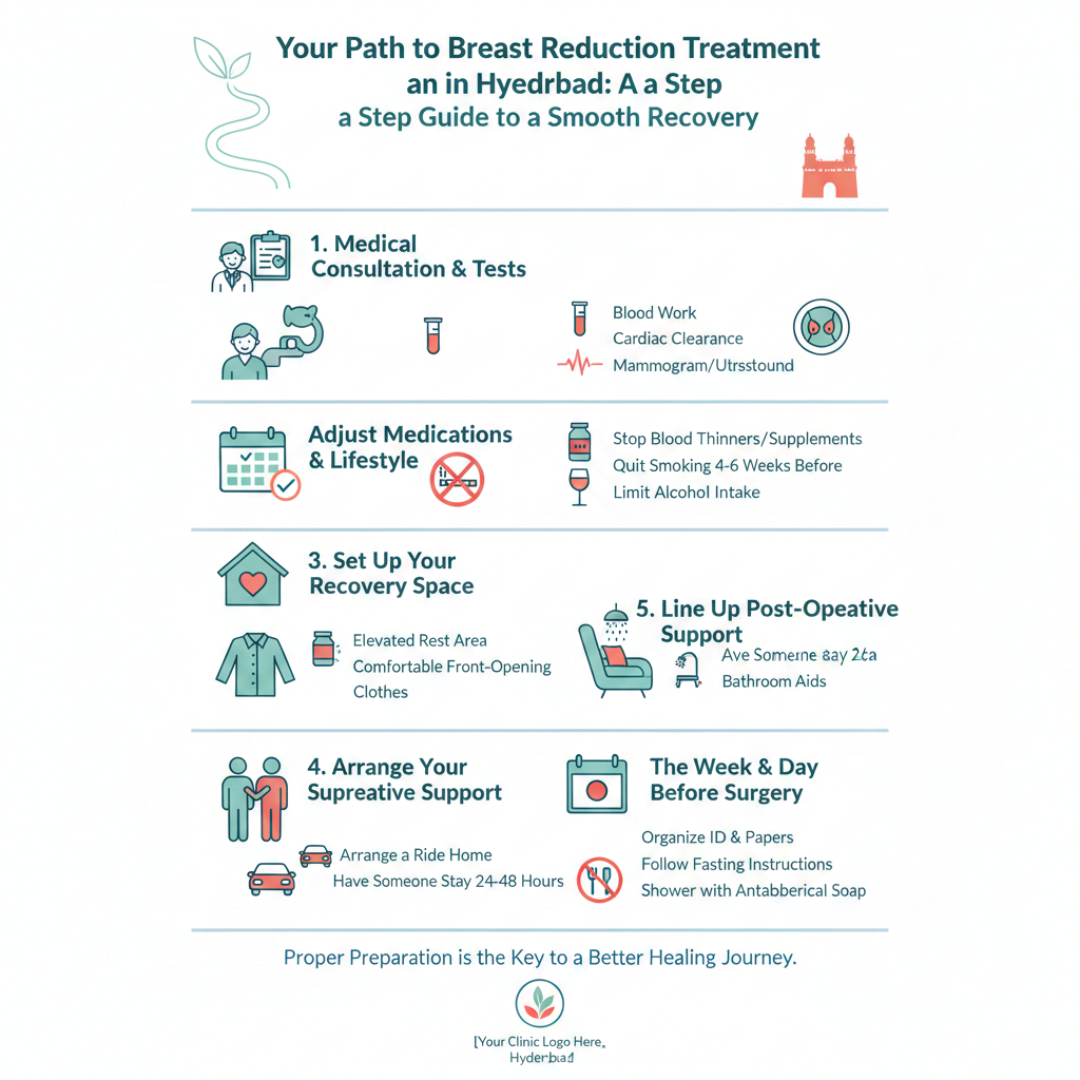 Preparing for breast reduction treatment involves medical evaluations, lifestyle adjustments, and practical arrangements at home. You will need to complete blood tests, stop certain medications, quit smoking at least 4 to 6 weeks before surgery, arrange post operative care, and prepare your recovery space. Proper preparation reduces complications and supports faster healing.