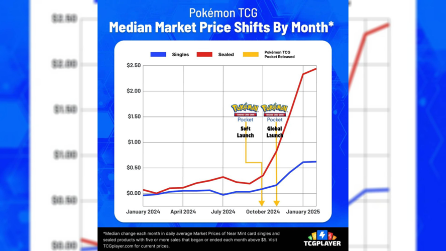 Analysts have observed that the increase in both the game's popularity and the resale value of physical cards aligns closely with the launch of Pokémon TCG Pocket exactly one year ago. Market trend graphs, sourced from TCGPlayer and published by Pokebeach, illustrate how median prices for genuine Pokémon cards have shifted over the past year, with clear markers indicating the platform's release date in October 2024.