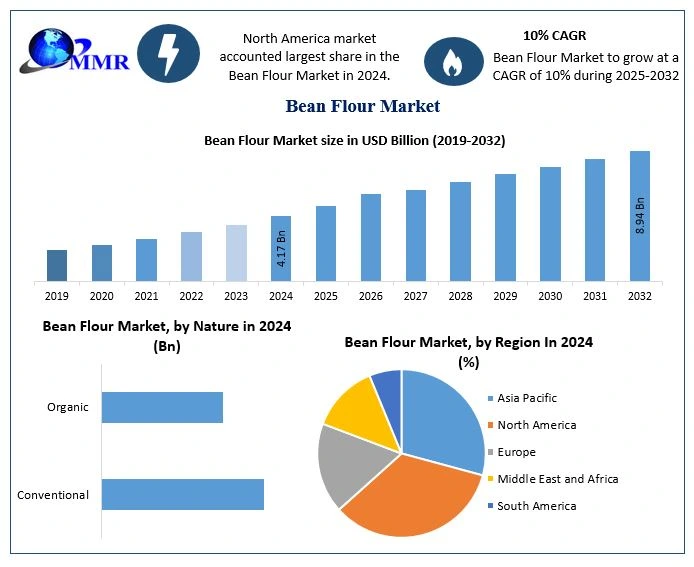 The global Bean Flour Market size was valued at USD 4.17 Billion in 2024 and is projected to reach USD 8.94 Billion by 2032, growing at a robust CAGR of 10% during the forecast period from 2025 to 2032. The market is witnessing significant momentum, fueled by rising health consciousness, the demand for protein-rich diets, and increasing adoption of clean-label and convenient food products.