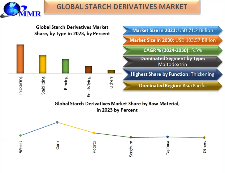 The Global Starch Derivatives Market is experiencing steady expansion driven by widespread application across food and industrial sectors. Starch derivatives are modified forms of native starch that have been chemically, physically, or enzymatically transformed to improve functionality—such as thickening, binding, stabilizing, and emulsifying properties—tailored for specific uses in food products, pharmaceuticals, paper, cosmetics, and more. The global starch derivatives market was valued at USD 71.2 billion in 2023 and is expected to grow at a CAGR of approximately 5.5% from 2024 to 2030, reaching nearly USD 103.57 billion by 2030.