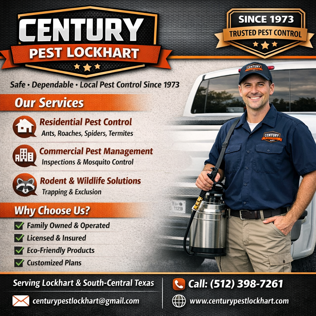 Century Pest Lockhart is a family-owned pest management company serving Lockhart and the surrounding areas of South-Central Texas with professional pest control solutions since 1973. The company offers comprehensive services for both residential and commercial properties, including prevention and elimination of common pests such as ants, cockroaches, termites, mosquitoes, rodents, and wildlife. Their team of licensed technicians uses environmentally safe products and customized treatment plans to protect homes and businesses, while emphasizing thorough inspections, effective strategies, and dependable customer service. With decades of local experience and a commitment to quality, Century Pest strives to deliver safe, effective, and long-lasting pest control solutions. https://centurypestlockhart.com/